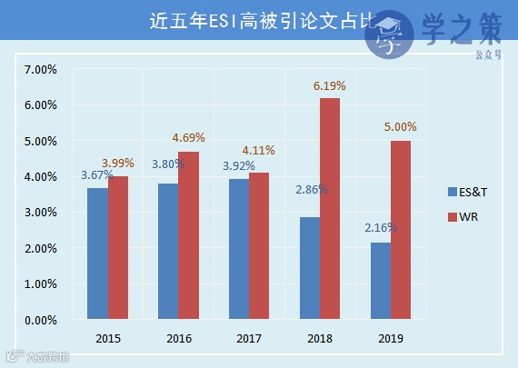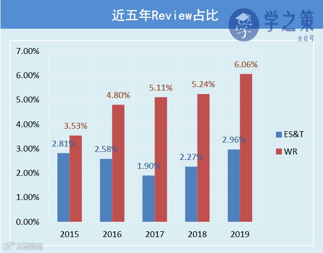 在Review占比方面,ES&T一直维持在一个较低的水准,而WR则逐年上涨,2019年已经是ES&T的两倍有余。较低的发文量和较高的Review占比,应该是WR的影响因子一直领先ES&T的主要原因。