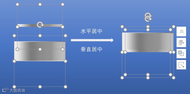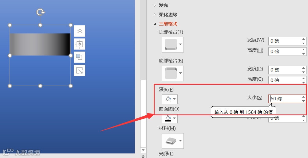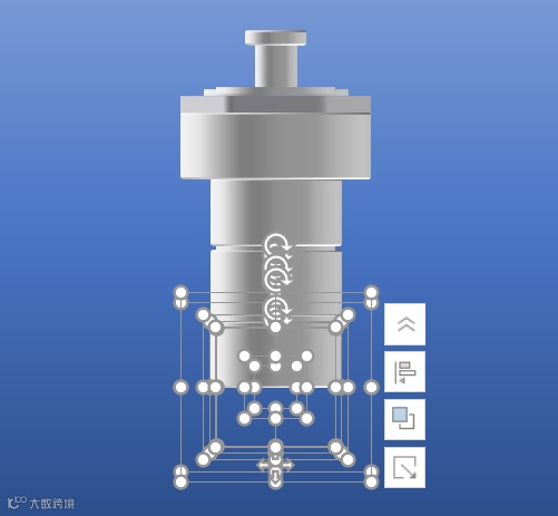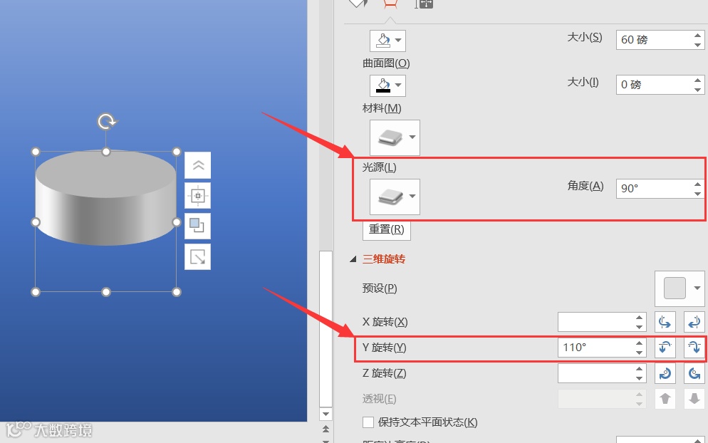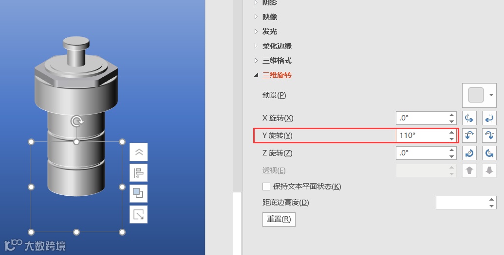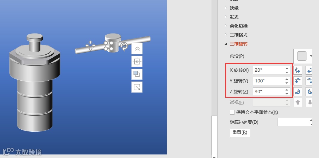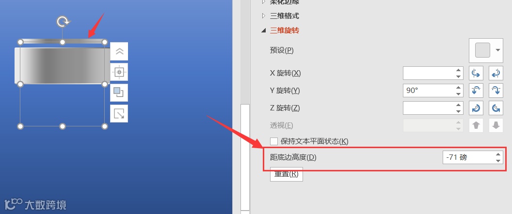 距底边高度是在三维旋转中设置。将大圆柱的距底边高度设为0磅,小圆柱的距底边高度设为正值或负值,就可以看到它发生相对上下的移动。(如果图形没有Y旋转90°的话,距底边高度就是往屏幕内或屏幕外垂直移动的距离)