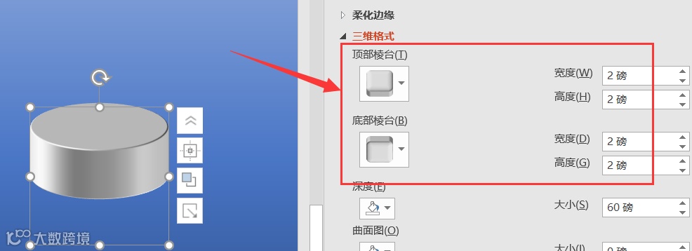 如果需要圆柱顶/底部边缘有圆角效果,可以设置顶部棱台或底部棱台的宽度和高度,下图是均设为2磅的效果。