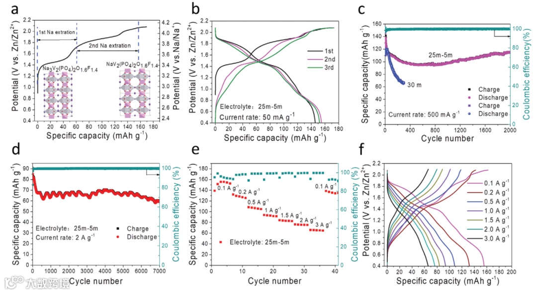 由图3所示:所 组 装 的 新 型NVPOF || Zn 水系电池可以表现出高的平均电压,较高的可逆容量和优异的循环寿命:在 50 mA g-1 的电流密度下,表现出 155 mA h g-1 的可逆容量,平均电压约为1.46 V。即使在 2 A g-1 的电流密度下,电极材料能有 7000 次的循环次数。这 个 性 能 远 远 超 过NVPOF || Zn 电池在纯的 30 m ZnCl2的电解液中的性能。