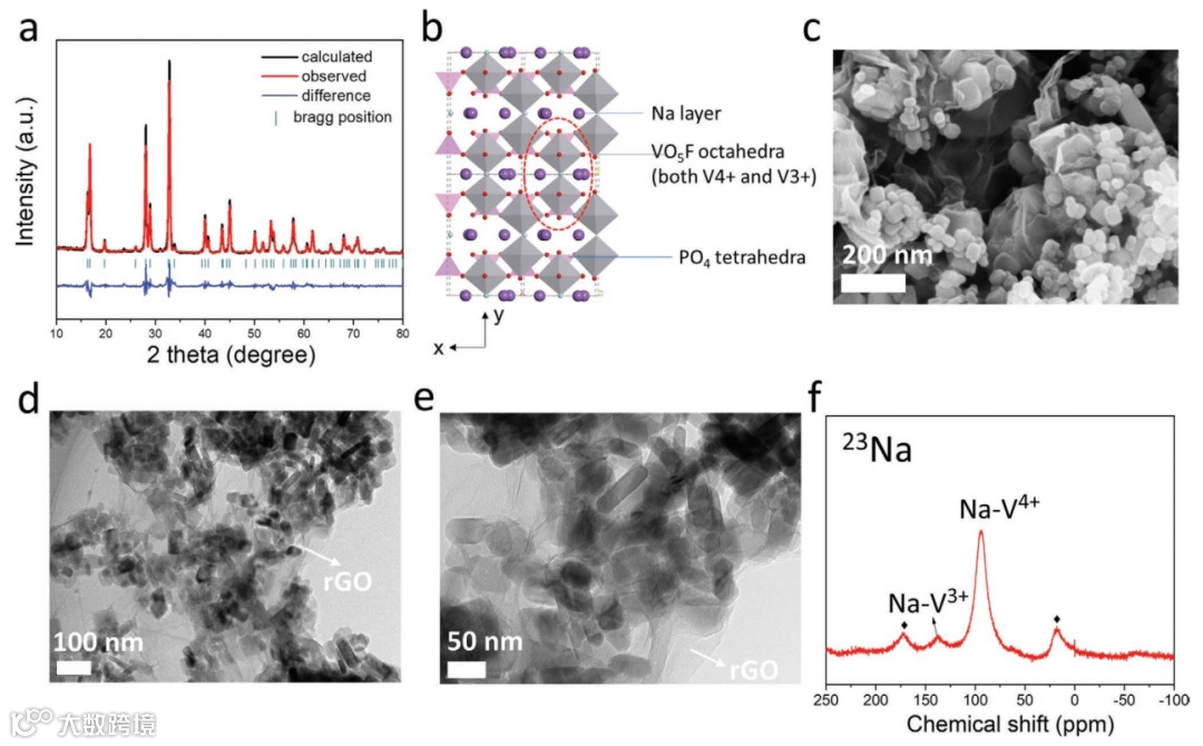 图1表明,制 备 的Na3V2(PO4)2O1.6F1.4 @rGO 材料由纳米块状的主体材料颗粒以及外层包裹的层状 rGO(5wt%)组成。作者进一步使用 ICP-OES和魔角旋转固体核磁波谱确定了化合物中混合价态钒的平均价为+3.8 价。