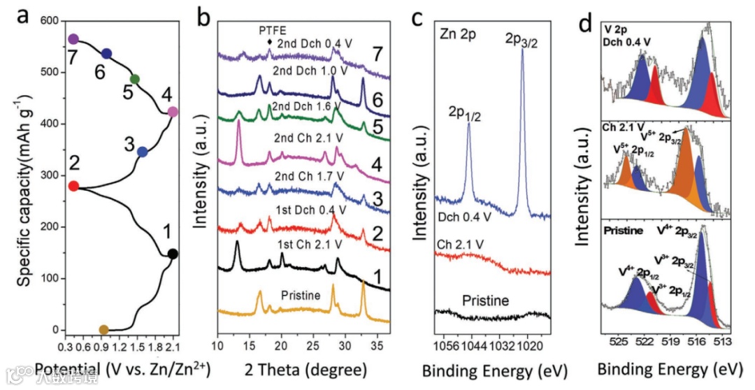 为了理解材料在充放电过程中结构转变机制,作者选择非原位 XRD 和XPS测试了材料在不同的电压下的状态。这些结果证实了材料的可逆性。此外,作者进一步讨论了该体系中是Zn2+和H+的共嵌入,没有Na+和NH4+的嵌入(更多实验细节见原文)。