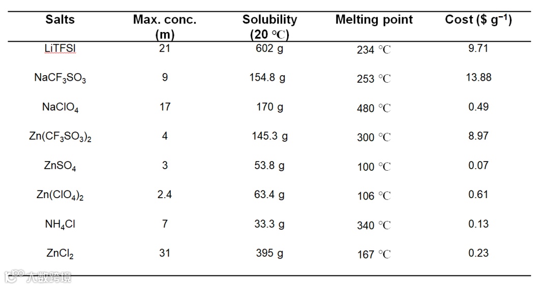 表1给出了目前常用的不同类型的水体系电解质的溶解度、安全性、成本等参数的对比。从表中可以明显看出使用 ZnCl2 和 NH4Cl 混合电解质相比目前常用的氟化电解质的价格优势。