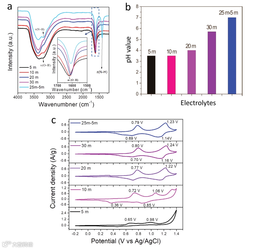 进一步,作者使用红外光谱(FTIR)来分析不同电解液中 Zn2+ 和水分子的相互作用。随着 ZnCl2 电解液浓度的升高(从 5 m 到 30 m),其中的自由水逐渐减少,而25m-5m 电解液其水分子的振动模式与 30 m ZnCl2 具有相似的特征。pH值测试表明,该25m-5m 电解液为中性电解质(pH接近7),这表明NH4Cl的加入有利于抑制水的电离。