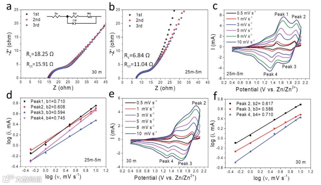 为了进一步理解 NVPOF 电极材料在不同电解液中的动力学差异,作者通过交流阻抗和循环伏安对比了电极材料在 25m-5m电解液中和30 m电解液中的动力学性能。在 25m-5m电解液中,计算得到的电荷转移阻抗 Rct 为 11.04 Ω,欧姆内阻 Rs 为 6.84 Ω,都小于在 30 m ZnCl2 电解液里面测到的值。