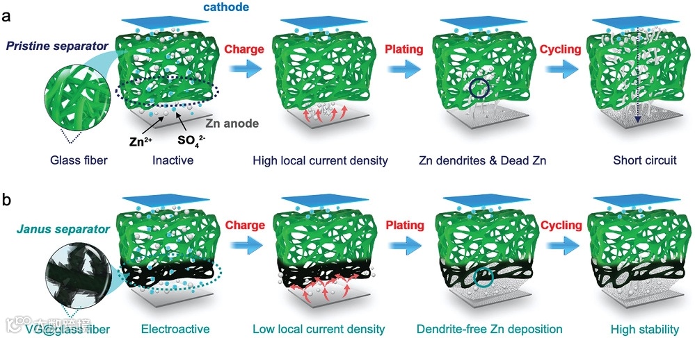在使用普通的玻璃纤维隔膜时,高局部电流密度下,锌离子在二维平面Zn负极上容易形成不均匀的分布与形核,在沉积/剥离的循环过程中容易产生枝晶,最后刺穿隔膜发生段路(图1a),而直接生长的电活性VG地毯所得到的Janus隔膜可以降低局部电流密度,获得更为均匀的局部电场,同时原子掺杂带来的亲锌性质将调控锌离子的分布和后续的沉积(图1b)。这种Janus隔膜可以视为锌负极的3D延续,以允许空间扩展来引导锌沉积。使用Janus隔膜可以避免形成枝晶和死锌而导致循环时短路。
