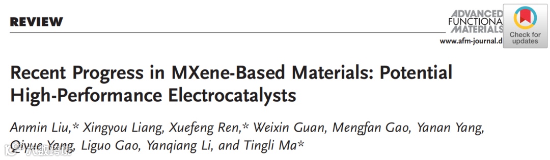 近日,大连理工大学刘安敏博士与九州工业大学马廷丽教授在国际著名学术期刊Advanced Functional Materials(影响因子:16.836)上发表题目为“Recent Progress in MXene-Based Materials: Potential High-Performance Electrocatalysts”的综述文章。