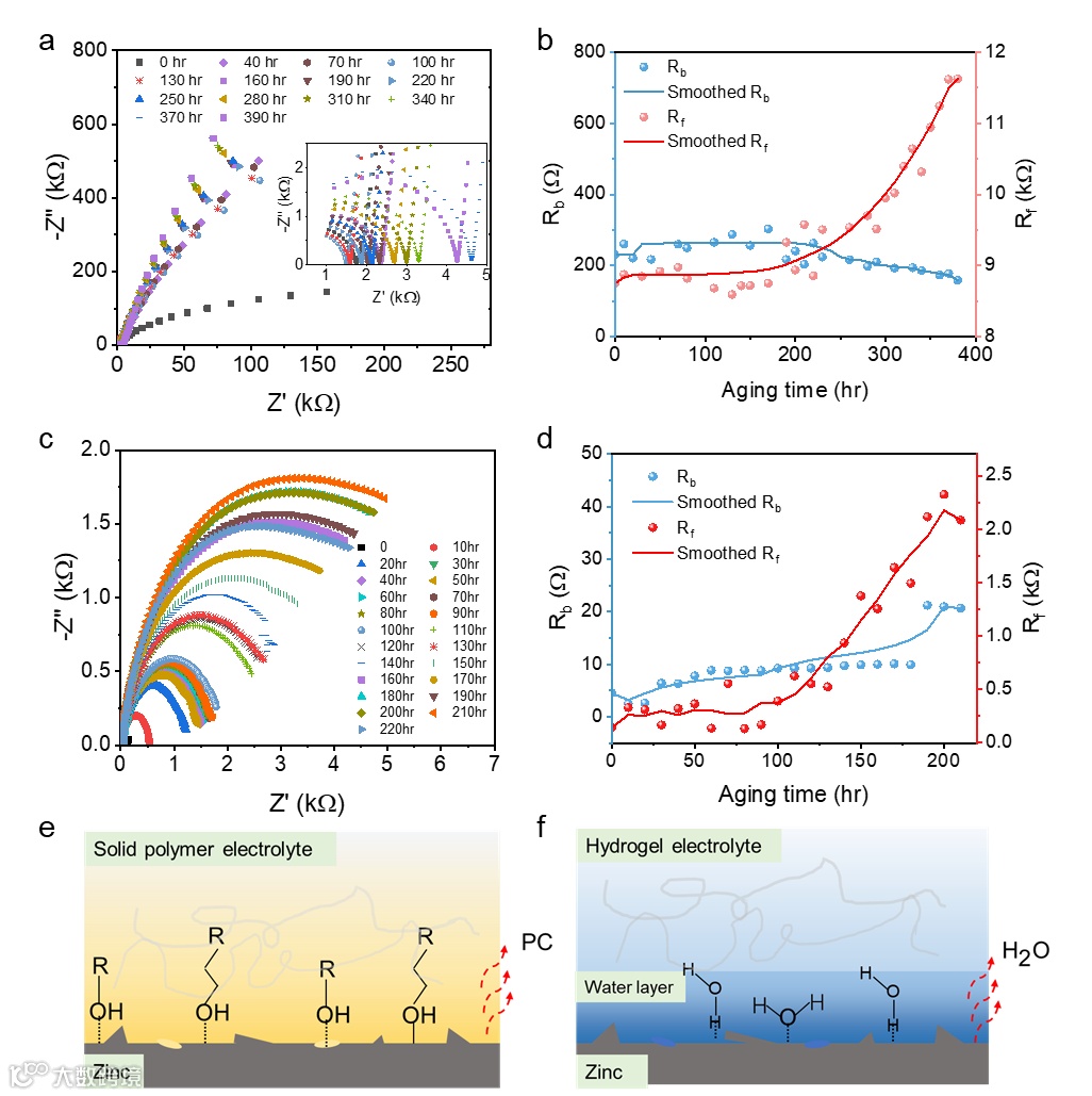 研究表明,在长时间的EIS衰老测试中,水凝胶电解质的界面电阻变化较为明显,仅维持了100小时。而一种基于环氧高分子的粘黏性固态电解质(PEGDGE)却能保持稳定200小时。除此之外,水凝胶电解质的内阻有着更为明显的变化,但固态电解质却维持着较为稳定的内阻。
