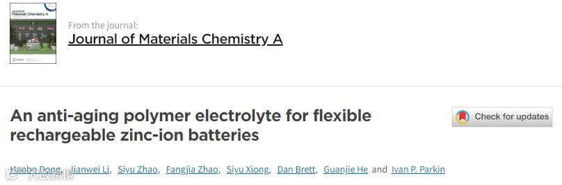 近日,伦敦大学学院Ivan Parkin教授和Guanjie He博士课题组研发出一种基于抗衰老固态电解质的柔性锌离子电池,并揭示和对比了固态高分子电解质和水凝胶电解质在衰老性上的表现。