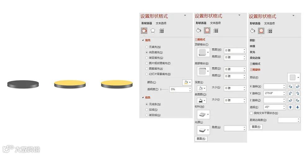 三维旋转:X旋转-0°,Y旋转-279.8°,Z旋转-0°,透视-45°。