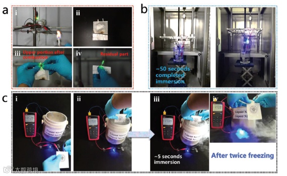 (a-c)软包电池在火烧、水下以及液氮中的服役性能测试。