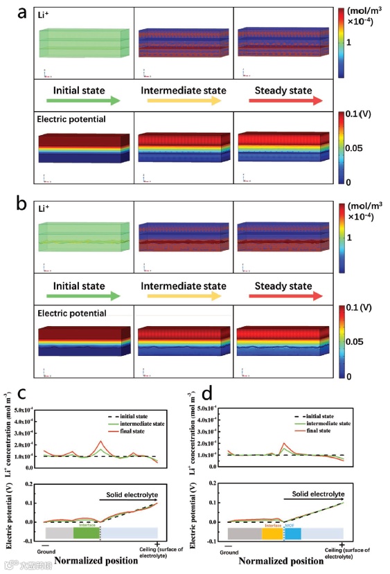 在引入含有MOF的高离子导复合凝胶层后,界面离子传输势垒减小,同时MOF的孔道会调控离子束流高效的均匀沉积,实现电势的均匀分布,而均匀分布的电势又会进一步诱导锂离子的均匀沉积,最终在界面处和电池内部整体实现良性的循环,保证电池的稳定循环。