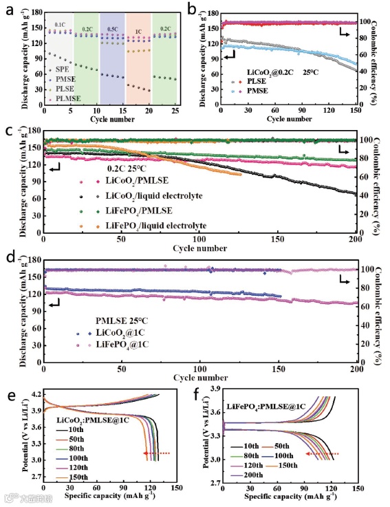 (a)使用不同固态电解质的LCO/Li电池的倍率性能图;(b)使用PMSE和PLSE两种复合固态电解质的LCO/Li电池的循环稳定性比较;(c)基于不同正极材料,使用双层异质复合固态电解质和液态电解液(1M LiTFSI/EC/DEC)组装的LCO/Li电池的循环稳定性比较;(d)1 C倍率下,基于不同正极材料,使用双层异质复合固态电解质基所组装的纽扣电池的循环稳定性图以及(e,f)不同圈数时的充放电曲线。
