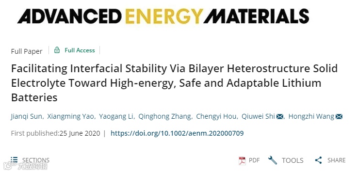 近日,东华大学王宏志课题组在国际著名期刊Advanced Energy Materials上发表题为“Facilitating Interfacial Stability Via Bilayer Heterostructure Solid Electrolyte Toward High-energy, Safe and Adaptable Lithium Batteries”的研究工作。