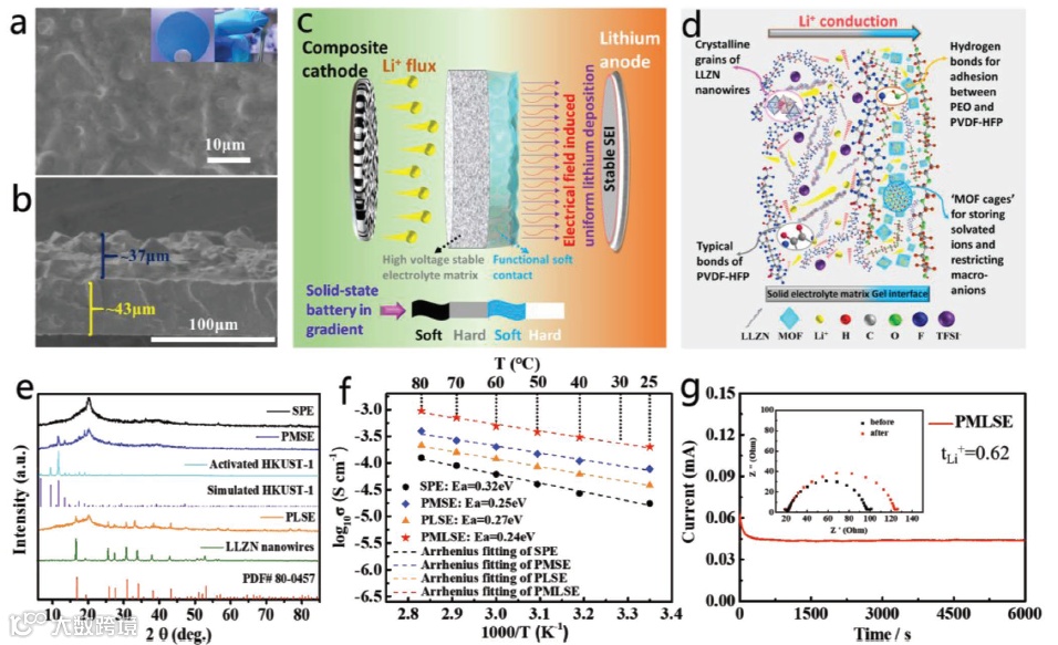 (a,b)双层异质复合固态电解质的实物图和扫描电镜图;(c,d)基于双层异质复合固态电解质构筑的固态电池以及固态电解质的内部结构示意图;(e)无机填料组分与各种固态电解质的XRD图;(f)不同固态电解质的阿伦尼乌斯曲线;(g)双层异质复合固态电解质的时间电流曲线。