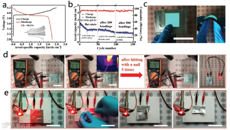 (a)基于双层异质复合固态电解质组装的固态软包电池的充放电曲线;(b)多次连续弯折后软包电池的循环稳定性;(c)软包电池与柔性发光片的集成演示;(d,e)固态软包电池的滥用性实验。