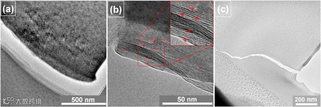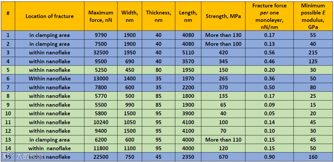 作者分析了拉伸试验中的断裂特征。对于较厚的纳米薄片,观察到一层一层的断裂(图4a)和大量不完整的层(图4b)。此外,断裂位置的(002)平面的存在表明层的弯曲及其部分分层。相比之下,对于较薄的纳米薄片,裂纹是在边缘开始的(图4c),因此我们假设失效开始于具有微裂纹和/或缺陷的边缘区域,后者充当应力集中器。