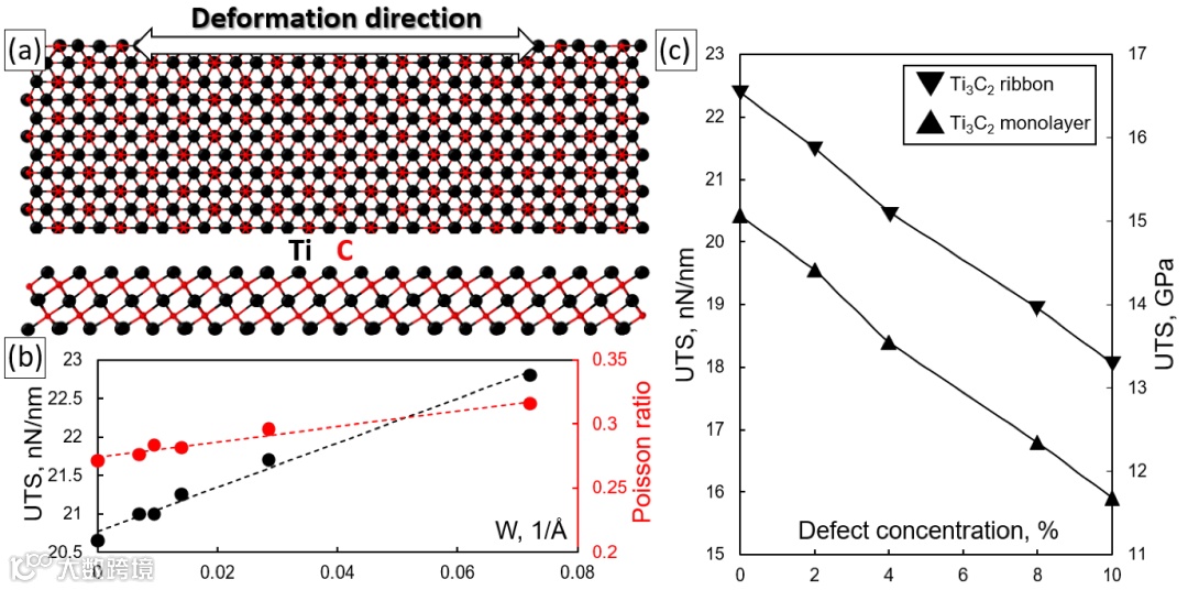 作者指出MXene中的结构缺陷会显著影响其在外载荷下的力学行为。在图5c中,以nN/nm(左轴)和GPa(右轴)单位表示的UTS与Ti3C2单层和宽度为3.4nm的Ti3C2纳米带中单空位浓度的依赖关系。在以GPa单位计算UTS值时,MXene层的有效厚度为1.35nm(基于TEM测量)。随着缺陷浓度的增加,UTS呈线性下降趋势。UTS相对较小测量值的来源可能是由于薄片中存在拓扑缺陷。