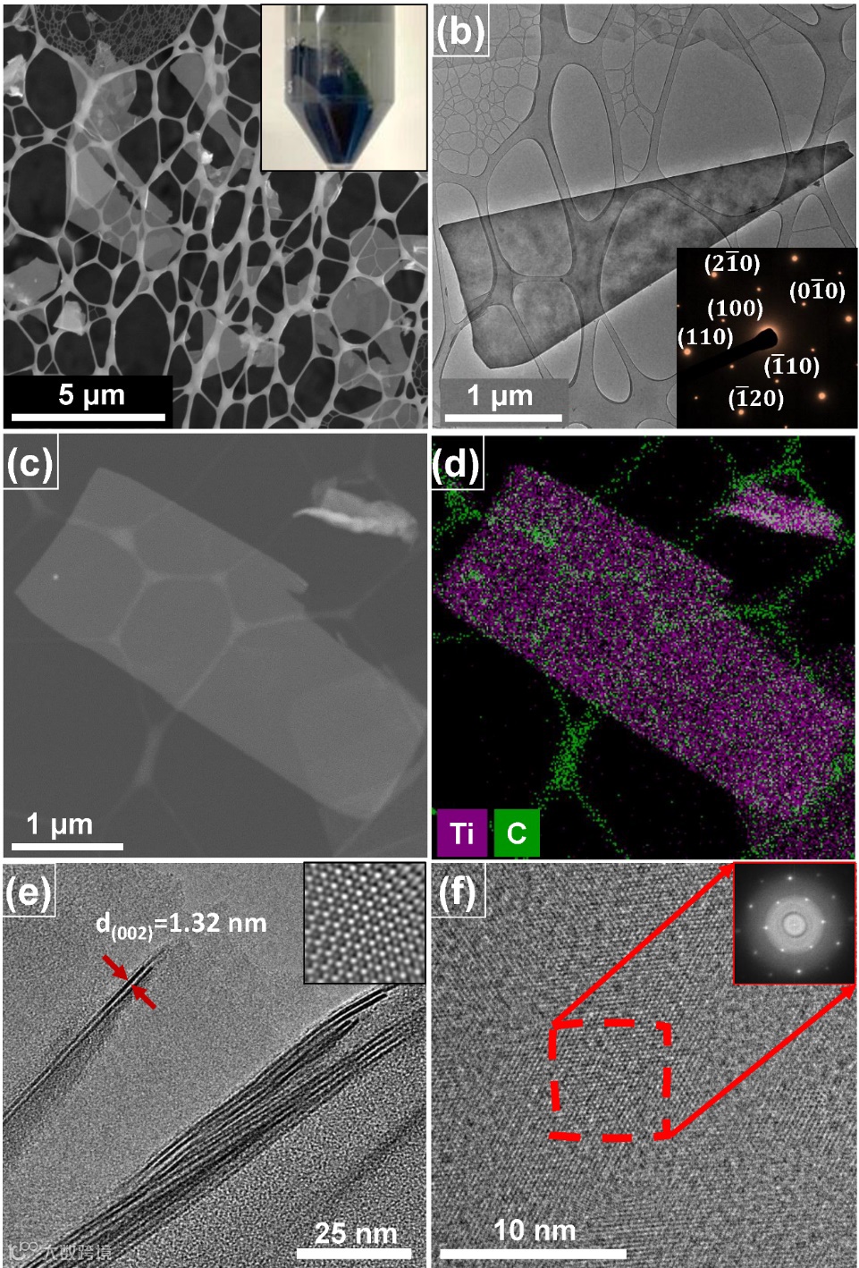 单个MXene纳米片的TEM图像和相应的选区衍射(SAED)图案(插图)如图1b所示。通过暗场扫描TEM(STEM)结合空间分辨能谱(EDX)分析确定了Ti3C2-MXene的化学成分。