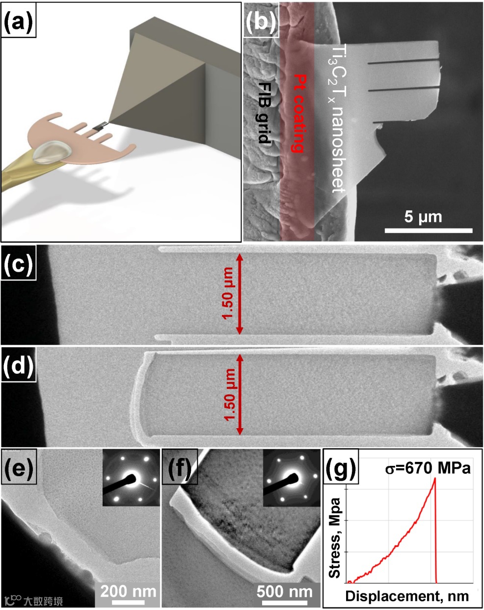 作者采用原位TEM进行拉伸试验,并测量了平行于基面的单个Ti3C2纳米片的极限拉伸强度(UTS)。实验装置如图3a所示。使用Ga聚焦离子束(FIB)和Pt沉积将所选MXene纳米片切割成带状形状,并将其粘合到FIB网格上。图3b显示了FIB样品制备后的纳米片。