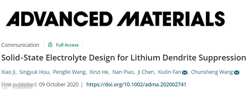 近日,马里兰大学Xiulin Fan,王春生教授等在国际期刊Advanced Materials 上发表题为“Solid-State Electrolyte Design for Lithium Dendrite Suppression”的研究工作。