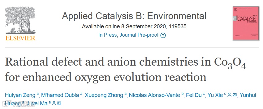 近日,吉林大学谢禹教授与同济大学马吉伟教授等合作。在国际顶级期刊Applied Catalysis B: Environmental (影响因子:14.229) 上发表题为“Rational defect and anion chemistries in Co3O4 for enhanced oxygen evolution reaction”的研究工作。