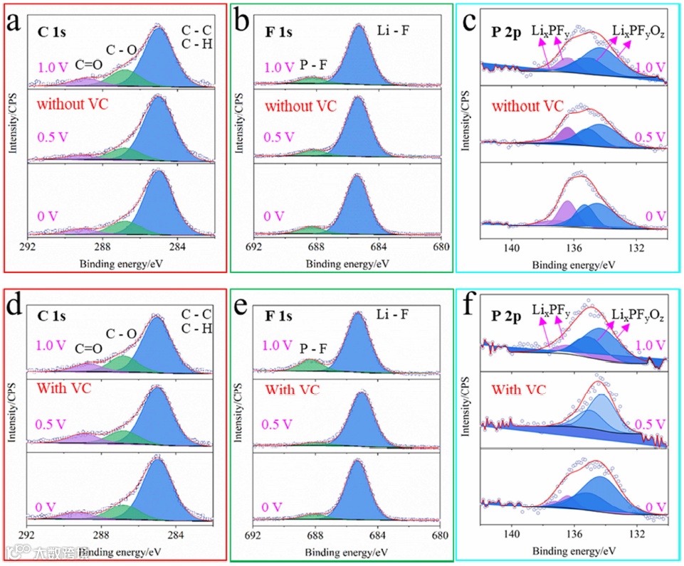 通过分析不同的原子所占比例发现,在两种电解液中C/F比有很大区别。无论截止电压是多少,在含有VC添加剂的电解液中的SEI, C/F比始终高于不含VC添加剂的电解液,证明有VC添加剂时SEI含有更多的有机组分,因为VC易于还原分解。