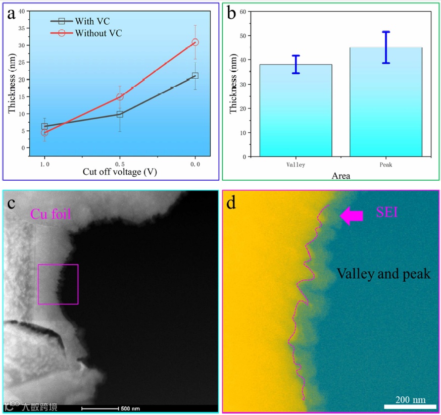 (a)不同截止电压下含有VC和不含VC的电解液中SEI厚度的变化。