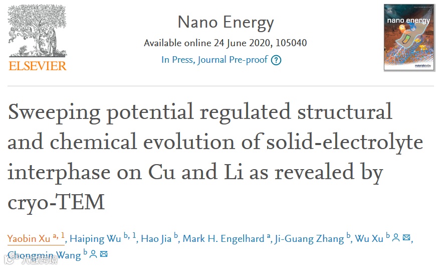 近日,王崇民博士课题组和许武博士课题组在国际顶级期刊Nano Energy (影响因子:15.548) 上发表题为“Sweeping potential regulated structural and chemical evolution of solid-electrolyte interphase on Cu and Li as revealed by cryo-TEM”的研究工作。