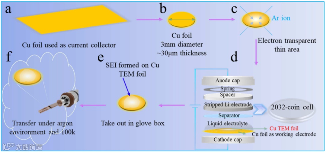 (f)在氩气保护、液氮温区条件下,将含有SEI的铜箔样品转移到透射电镜。