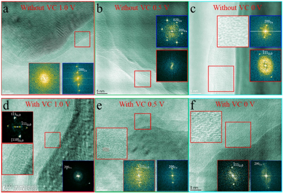 (d-f)含有VC添加剂的电解液中在截止电压为(d)1 V,(e)0.5 V和(f)0 V形成的SEI高分辨透射电子显微像。插图:SEI(红色)和铜箔(蓝色)的快速傅里叶变换图。
