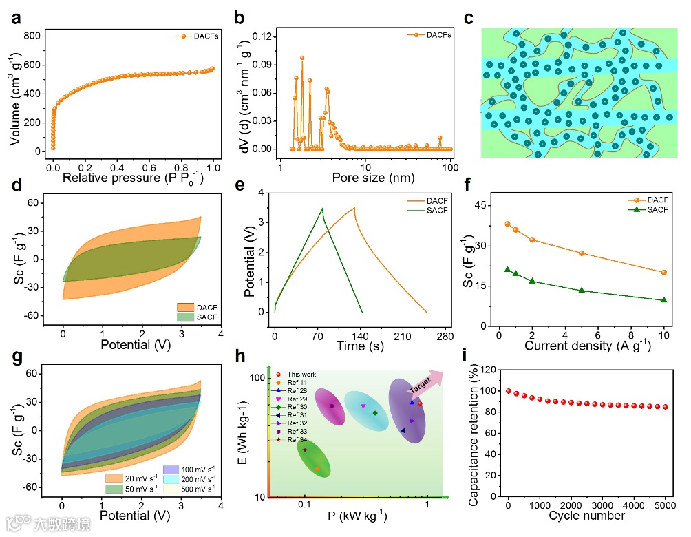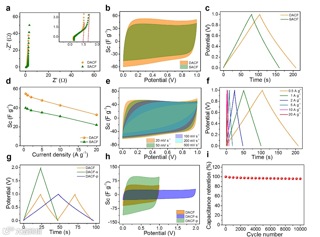 图4. DACFs对称超级电容器在6 M KOH电解液中的电化学性能