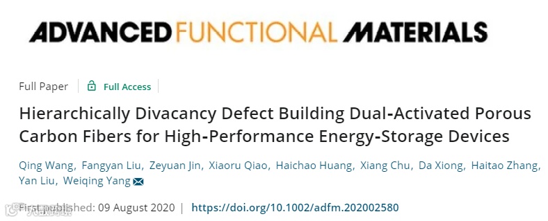 近日,西南交通大学材料学院杨维清课题组在国际顶级期刊Advanced Functional Materials (影响因子:16.836) 上发表题为“Hierarchically Divacancy Defect Building Dual-Activated Porous Carbon Fibers for High-Performance Energy-Storage Devices”的研究工作。