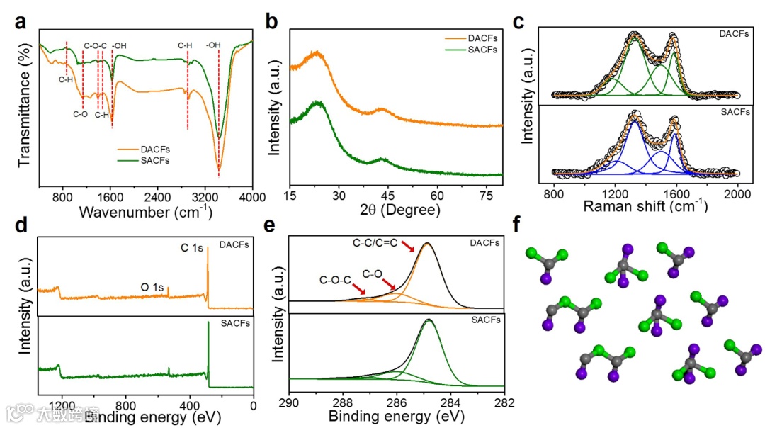 该工作通过分子预嵌技术和层级双空位缺陷构建平台成功制备出高度互联互通的三维多孔碳纤维(DACFs),并对它的机理进行了详细的阐述。不同于目前广泛研究的KOH研磨高温活化,他们采用分子预嵌的技术将KOH分子铆接在苎麻纤维的内部。在高温活化的过程,KOH分子优先与纤维素-OH上的C原子反应形成空位。