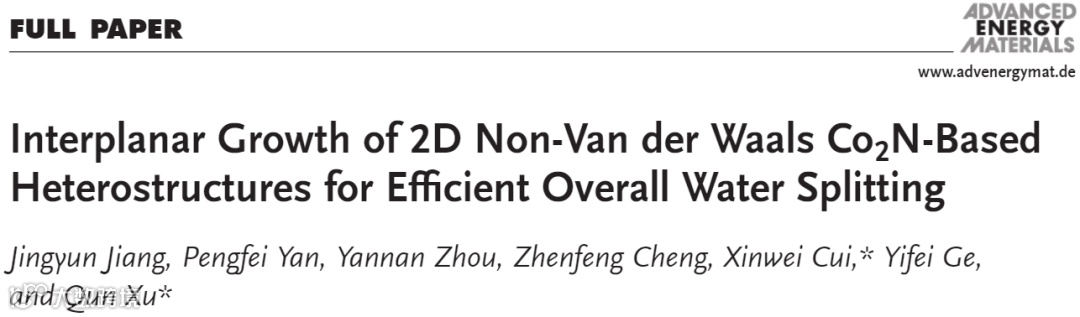 近日,郑州大学的许群教授和崔鑫炜老师在国际顶级期刊Advanced Energy Materials (影响因子:25.245) 上发表题为“Interplanar Growth of 2D Non‐Van der Waals Co2N‐Based Heterostructures for Efficient Overall Water Splitting”的研究工作。