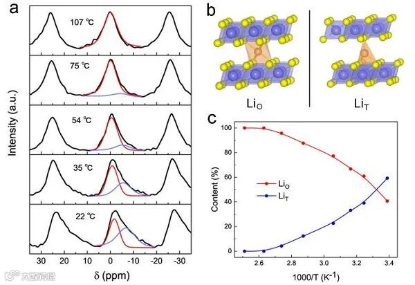 MAS-NMR(魔角旋转核磁共振)测试对Li的局部环境敏感,可以精确确定相应的化学位移。在此,对Li0.31Ag0.69CrS2晶体进行了变温7Li MAS NMR测试,结果如图4a所示。随着温度升高,分辨良好的峰逐渐变得对称。不同的Li化学位移,表明Li0.31Ag0.69CrS2样品中存在两种配位环境。考虑到Li+可以容纳四面体和八面体位点,这种NMR信号可归因于层间通道中Li+的不同配位结构(图4b)。在此,可以将在-0.5 ppm处的7Li化学位移分配给八面体位点(LiO),将另一个信号分配给四面体位点(LiT)。从图4c中可以看出,LiT的含量随着温度升高而急剧下降,最终在100 ℃以上降至零。相应地,LiO在加热过程中逐渐占主导地位。结果进一步证明,在Li插层样品中,Li是转变温度之前离子迁移的主要物质,并且还可以合理地推断出,占据四面体位点的Li+在离子输运中起着更重要的作用。由于化学插层和取代,四面体配位的Ag+被Li部分取代。四面体位点的Li+在室温下具有较低的活化能和较高的扩散率,从而在由Ag柱支撑的2D蜂窝结构中导致快速的离子电导率。