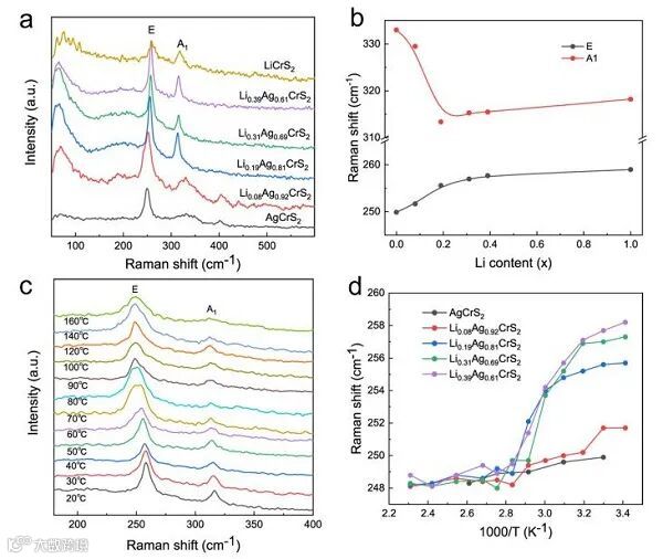 图5. 通过拉曼测量分析结构演变。(a)LixAg1-xCrS2在30 ℃时的拉曼光谱。(b)不同Li含量下E和A1峰的变化。(c)Li0.31Ag0.69CrS2的变温拉曼光谱。(d)LixAg1-xCrS2中E峰的变温拉曼位移。