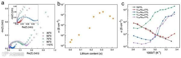 图3. LixAg1-xCrS2晶体的电导率测量。(a)Li0.31Ag0.69CrS2晶体的奈奎斯特图,温度范围为30至110 ℃。(b)25 ℃下,具有不同Li含量的LixAg1-xCrS2晶体的离子电导率。(c)LixAg1-xCrS2晶体温度依赖的离子电导率。
