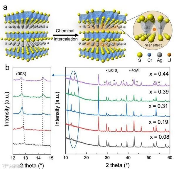 图1. AgCrS2的化学插层。(a)部分Ag+被Li+取代的插层过程示意图,在室温下产生快速的离子电导率。(b)插层反应过程中AgCrS2结构演化的XRD分析。