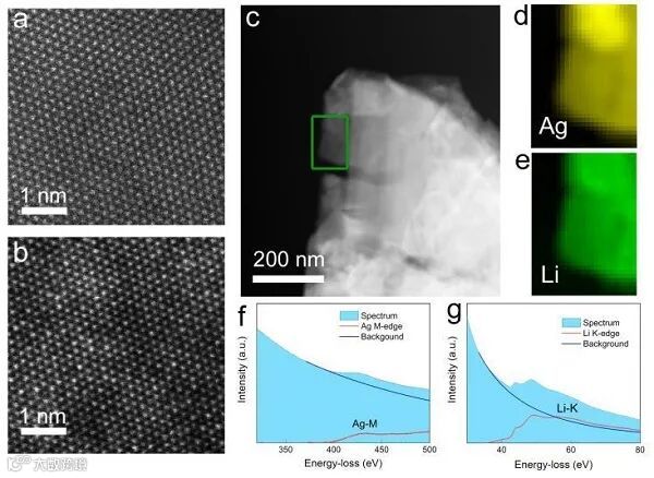 进一步进行了结构和化学表征,以揭示AgCrS2晶格中的Li分布。如图2a和b所示,HAADF图像清楚地表明原始的AgCrS2堆垛在一个三角形的晶格中,其中每个点的亮度几乎是均匀的。当插层Li原子时,部分Ag原子被取代,因此导致亮度变弱且不均匀。此外,EELS图像在反应过程中提供了Ag-M和Li-K边缘的精细成像。如图2c-g所示,Li和Ag均分布在整个区域中,表明插层后的成分均匀。这些结果表明,Li原子进入AgCrS2的晶格并形成LixAg1-xCrS2固溶体。