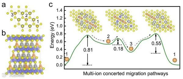 如图6a和b所示,由于Ag+的支柱效应,Li扩散会沿着[CrS2]层之间的层间平面发生,然后通过四面体和八面体空隙跃入下一个四面体位点。穿过扩散通道的跃迁和可移动的多离子相互作用都构成了这种迁移能垒。重要的是,柱状结构可以使输运骨架刚性化,从而削弱S2-与Li+的结合能,并保护Li+免受电势极小值的束缚。因此,扩散过程表现出具有非常小能垒的多离子协同迁移现象(图6c)。因此,在以较大半径的Ag+为支柱的层状结构中,Li+可以实现低活化势垒和高离子电导率。