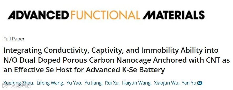 近日,中国科学技术大学余彦教授等在国际顶级期刊Advanced Functional Materials (影响因子:15.621) 上发表题为“Integrating Conductivity, Captivity, and Immobility Ability into N/O Dual‐Doped Porous Carbon Nanocage Anchored with CNT as an Effective Se Host for Advanced K‐Se Battery”的研究工作。