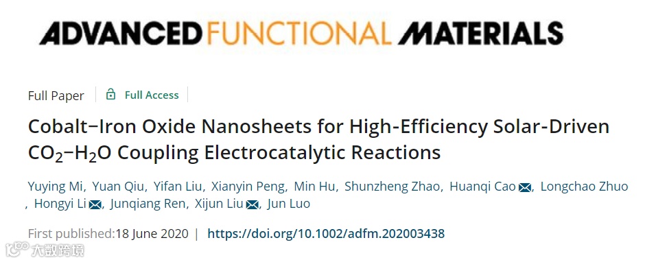 文章链接:Cobalt−Iron Oxide Nanosheets for High-Efficiency Solar-Driven CO2−H2O Coupling Electrocatalytic Reactionshttps://onlinelibrary.wiley.com/doi/10.1002/adfm.202003438 导师简介: 刘熙俊 研究员刘熙俊,天津理工大学新能源材料与低碳技术研究院副研究员。主要从事新能源纳米材料设计合成以及电催化性能研究工作。以第一/共同第一/通讯/共同通讯作者身份在Nature Communications,Angewandte Chemie International Edition,Nano Energy和Applied Catalysis B Environmental等国际期刊发表30余篇论文。曹焕奇 教授曹焕奇,天津理工大学材料科学与工程学院副教授。主要从事凝聚态物理、新型太阳能电池、有机光电器件研究工作。