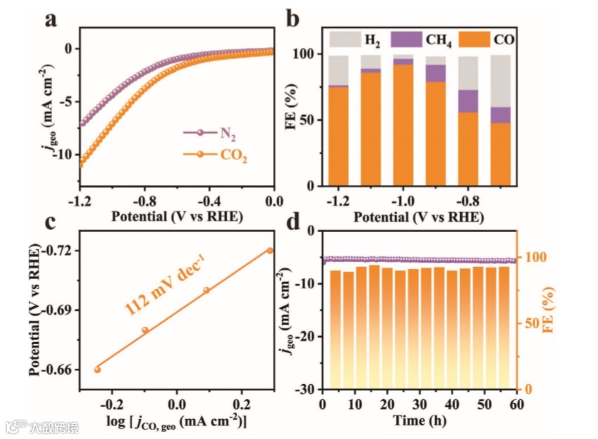 Electrocatalytic CO2RR performance. a) CO2RR LSV curves of Co2FeO4 recorded in CO2 or N2-saturated 0.1 m KHCO3 solution at a scan rate of 10 mV s−1; the current densities (jgeo) were normalized by the geometric surface area of the electrode. b) Faradaic efficiencies toward CO2RR products (CO, CH4, and H2) at various applied potentials. c) Tafel plot of Co2FeO4 nanosheet arrays corresponding to the LSV data. The iR-corrected potential is plotted against the logarithmic jco,geo. d) The current density and Faradaic efficiency measured at 1.0 V vs RHE.