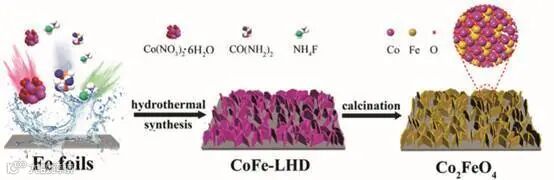 因此,作者展示了一种双功能的Co2FeO4催化剂,其具有在Fe衬底上支撑的分层纳米片阵列结构。该催化剂用作CO2RR的正极催化剂,在-1.0v和可逆氢电极(vs-RHE)下对CO的法拉第效率为92%,表现出优异的性能。此外,在电流密度为10ma cm -2时,Co2FeO4催化剂表现出优异的OER催化性能,超低过电位为230mv。利用正极和负极催化剂,作者展示了一个以GaInP2/GaAs/Ge三结太阳能电池为电源、双极膜为分离器的太阳能驱动的OCO2S结构系统。在较高的电流密度为13.1ma cm-2时,该集成系统的STFCO转换效率显著提高,约为15.5%,CO法拉第平均效率为92.3%。密度泛函理论(DFT)计算表明,与Fe取代物相邻的Co中心通过加速关键中间体(COOH和O)的形成,同时充当CO2RR和OER的高活性中心。