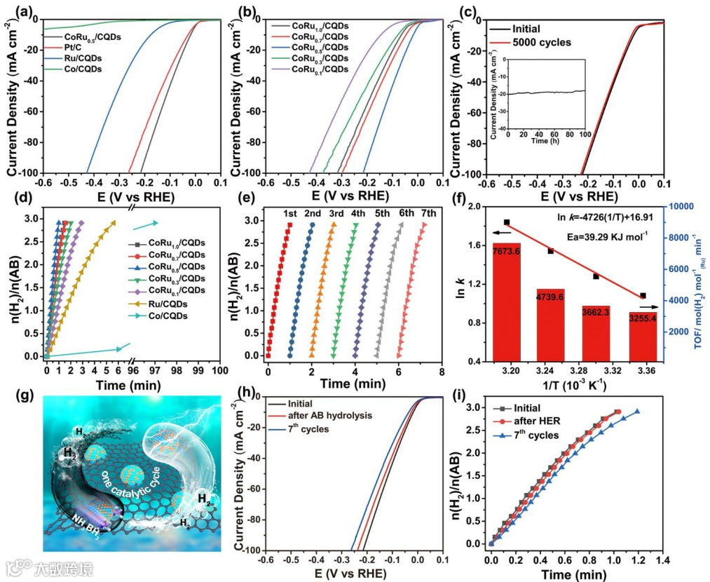要点三:CoRu0.5/CQDs在七个交替循环中对HER和AB水解都表现出优异的循环稳定性,表明该催化剂在未来制氢应用中具有优异的潜力。