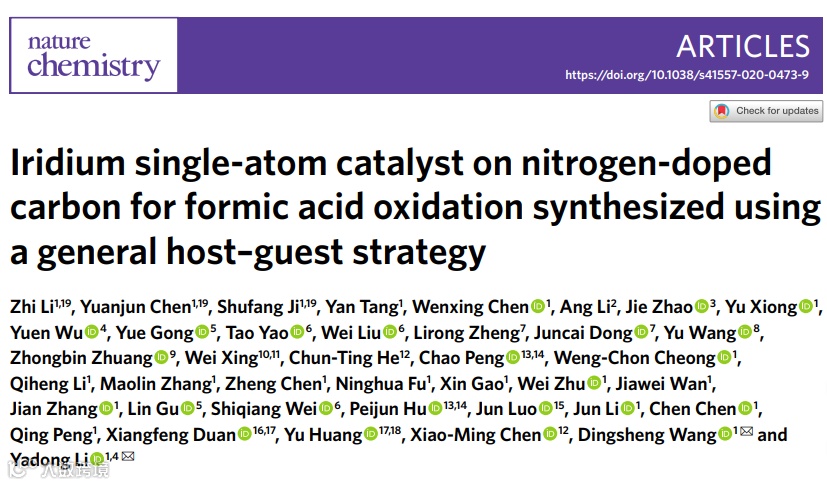 近日,清华大学李亚栋院士,王定胜副教授等在国际知名期刊Nature Chemistry上发表题为“Iridium single-atom catalyst on nitrogen-doped carbon for formic acid oxidation synthesized using a general host–guest strategy”的论文。Zhi Li, Yuanjun Chen, Shufang Ji为本文共同第一作者。