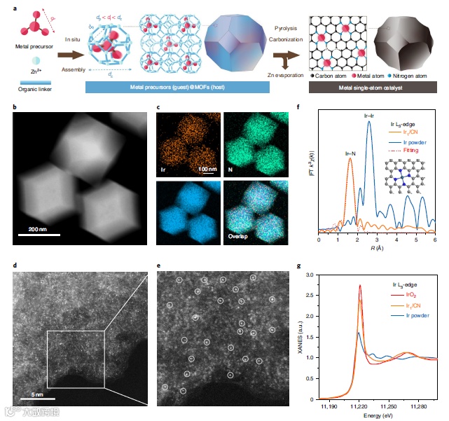 图1. 图片概要具体而言,本文报道了一种通用的主客体策略,可以在掺氮碳(M1/CN,M = Pt,Ir,Pd,Ru,Mo,Ga,Cu,Ni,Mn)上制备各种金属单原子催化剂。在这些金属SACs材料中,研究人员发现Ir1/CN具有较高的催化活性。