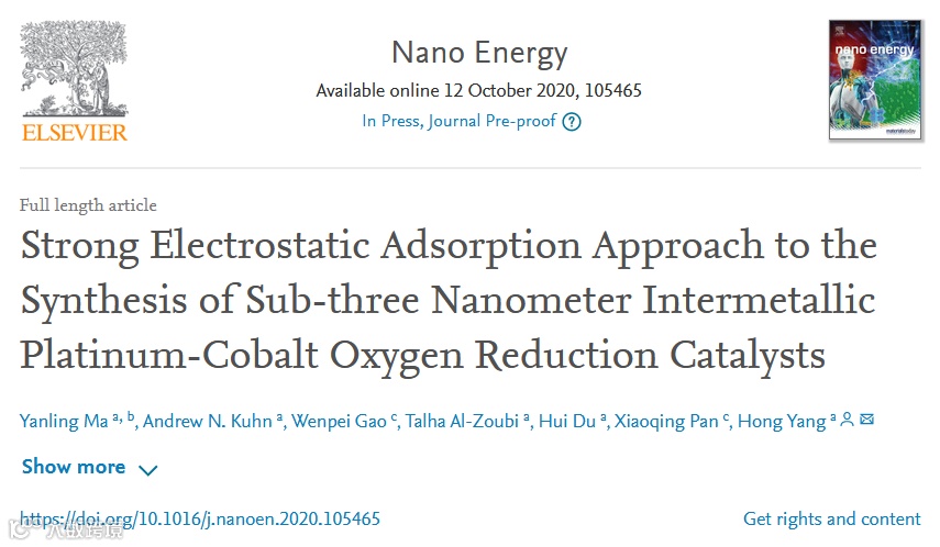 近日,伊利诺伊大学香槟分校杨宏教授课题组,在国际顶级期刊 Nano Energy (影响因子:16.602) 上发表题为“Strong Electrostatic Adsorption Approach to the Synthesis of Sub-three Nanometer Intermetallic Platinum-Cobalt Oxygen Reduction Catalysts”的研究工作。