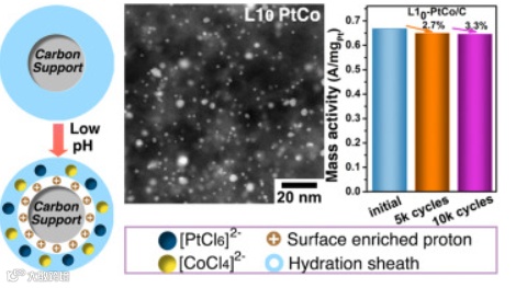 导读:该工作报道了一种利用强静电吸附理论,制备小于三纳米的PtCo金属间化合物纳米颗粒作为ORR低铂电催化剂的方法。通过调节溶液的pH值,利用载体材料表面对带电粒子的强静电吸附作用,实现了对直接生长在介孔碳